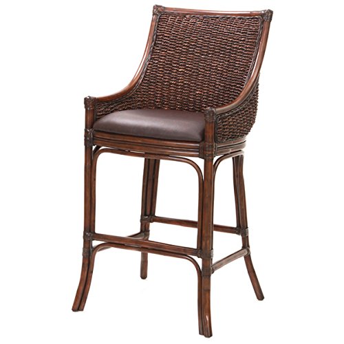Enjoy the comfort, relaxation and satisfaction while you unwind in this casual styled brown Wicker Counter Stool. The gorgeous woven rattan back and sides give the stool a tropical style for any room. Finished in rich brown with a dark brown bonded leather seat, this stool is highlighted by its gorgeous rattan back with genuine hand applied leather strapping and solid wood cap rail. The solid hardwood cap rail adds beauty and stability. This comfortable stool features a 3-inch cushion, flared legs add to the style and a comfortable footrest for easy on and off. This stool is hand woven by artisan craftsmen.