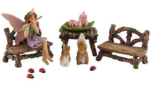 - INCLUDED IN THIS SET: 1 x Miniature Angel Fairy With Flute, 2 x Garden Benches, 1 x End Table, Leave With Teaset (4pce),4 Lady Bugs, 1 Squirrel and a Bunny