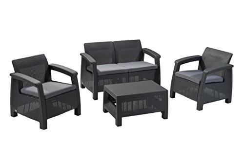 You can read main features below to know more about Keter Corfu 4 Piece Set All Weather Outdoor Patio Garden Furniture w/ Cushions, Charcoal.
