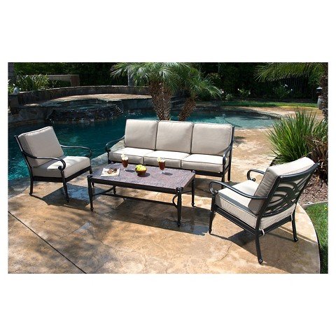 The Kent 4-Piece Metal Conversation Set is a beautiful way to update your outdoor space. This set includes a sofa, 2 club chairs and a coffee table. The comfy beige cushions are filled with polyester and covered with soft yet hardwearing Olefin fabric. The durable framework is constructed of aluminum with stainless steel hardware, and is powder coated to stand up to the elements. The table top also has decorative stone accents. The pieces are weather and rust resistant. Wipe clean with a dry cloth. Limited 2 year manufacturer warranty. ||Assembly Tip:While assembling this item,KEEP BOLTS LOOSE until all bolts are started.Then go back and tighten all bolts prior to use. ||Includes: 2 patio arm chairs, 1 patio sofa, 1 patio coffee table ||Warranty: 2 Year Limited Warranty ||Assembly Details: assembly required, tools provided ||Seating Capacity: 4 ||Care and Cleaning: Wipe Clean with a Dry Cloth ||Protective Qualities: Weather-resistant, Rust-resistant ||Number of Pieces: 4 ||Patio Armcha